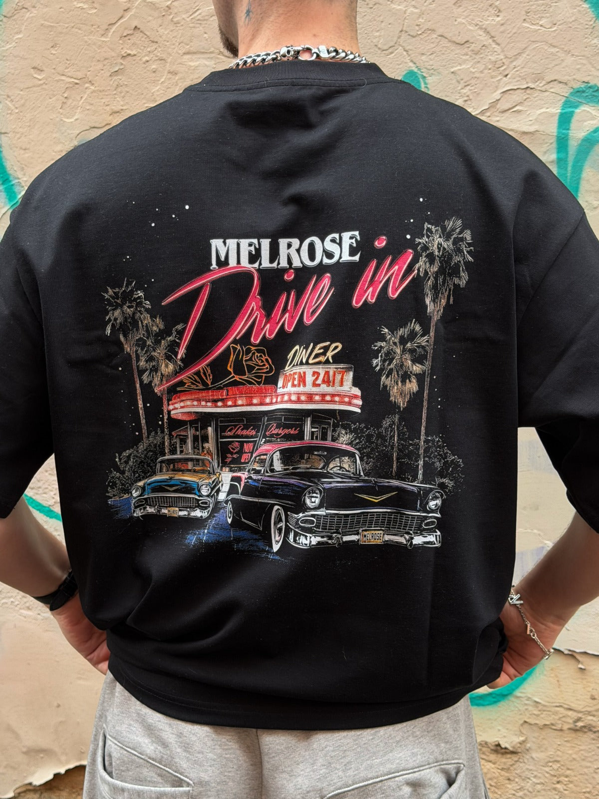 Vintage-inspired back graphic capturing an 80s drive-in diner scene. Classic cars, palm trees, and the open-all-hours diner combine with the signature Melrose rose to create a feeling of familiarity and ease.